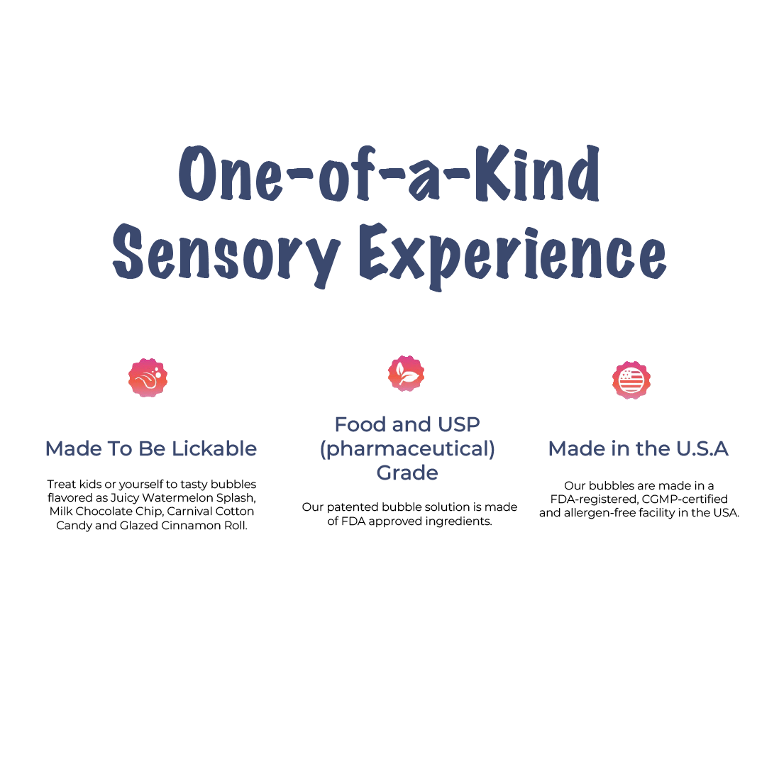 Fun and tasty bubble treats for kids and adults! Safe & tasty bubbles created by pediatricians: BubbleLick are lickable, edible watermelon-flavored bubbles. These bubbles are safe and comprised of only Food-Grade and USP (Pharmaceutical) grade ingredients.