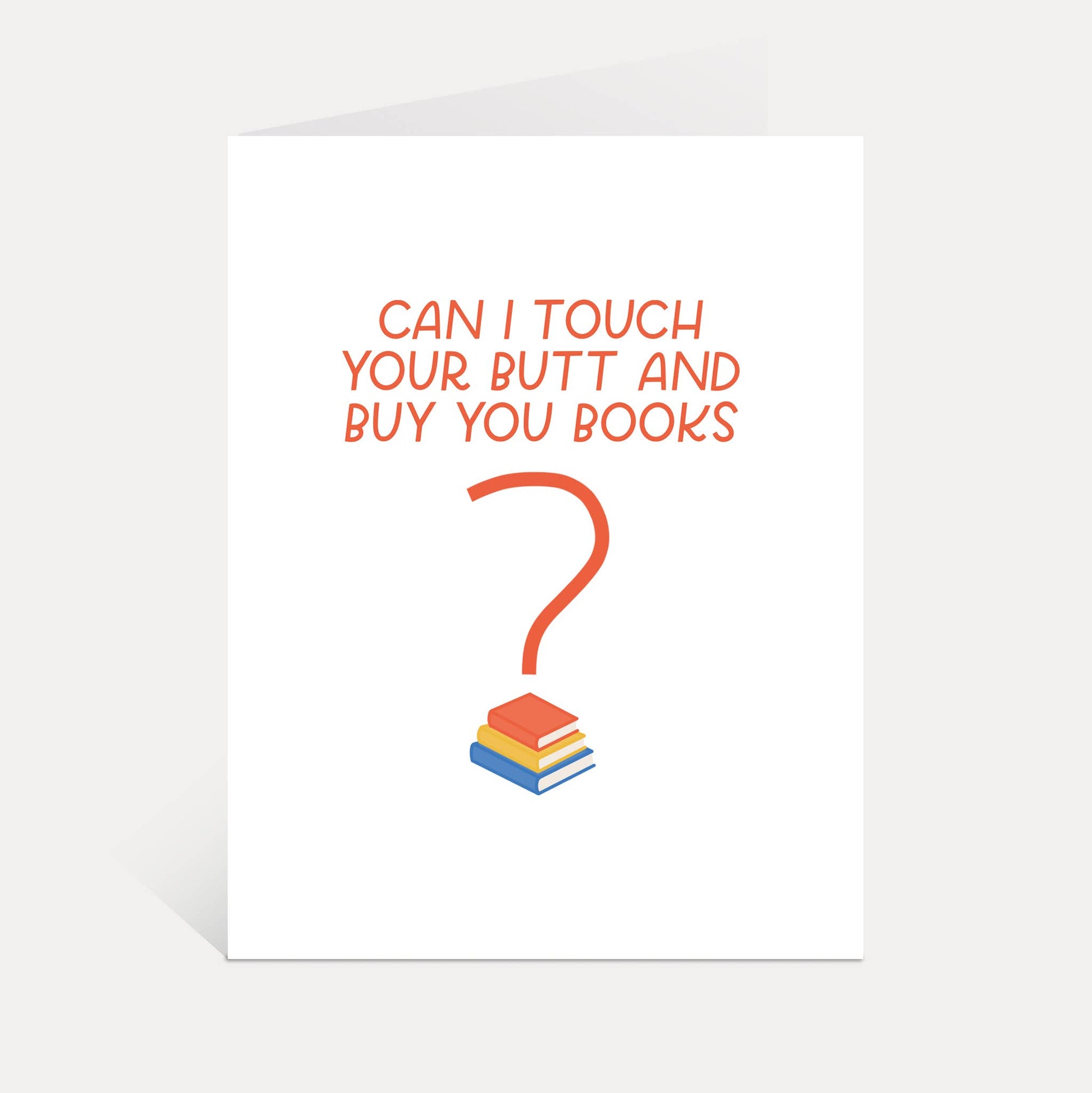 Can I Touch Your Butt + Buy You Books Greeting Card. A2 size (4.25” x 5.5”). Folded greeting card, blank inside. Professionally printed on white card stock. Cello sleeve and envelope included. Hand lettered + designed in Michigan, printed in USA.