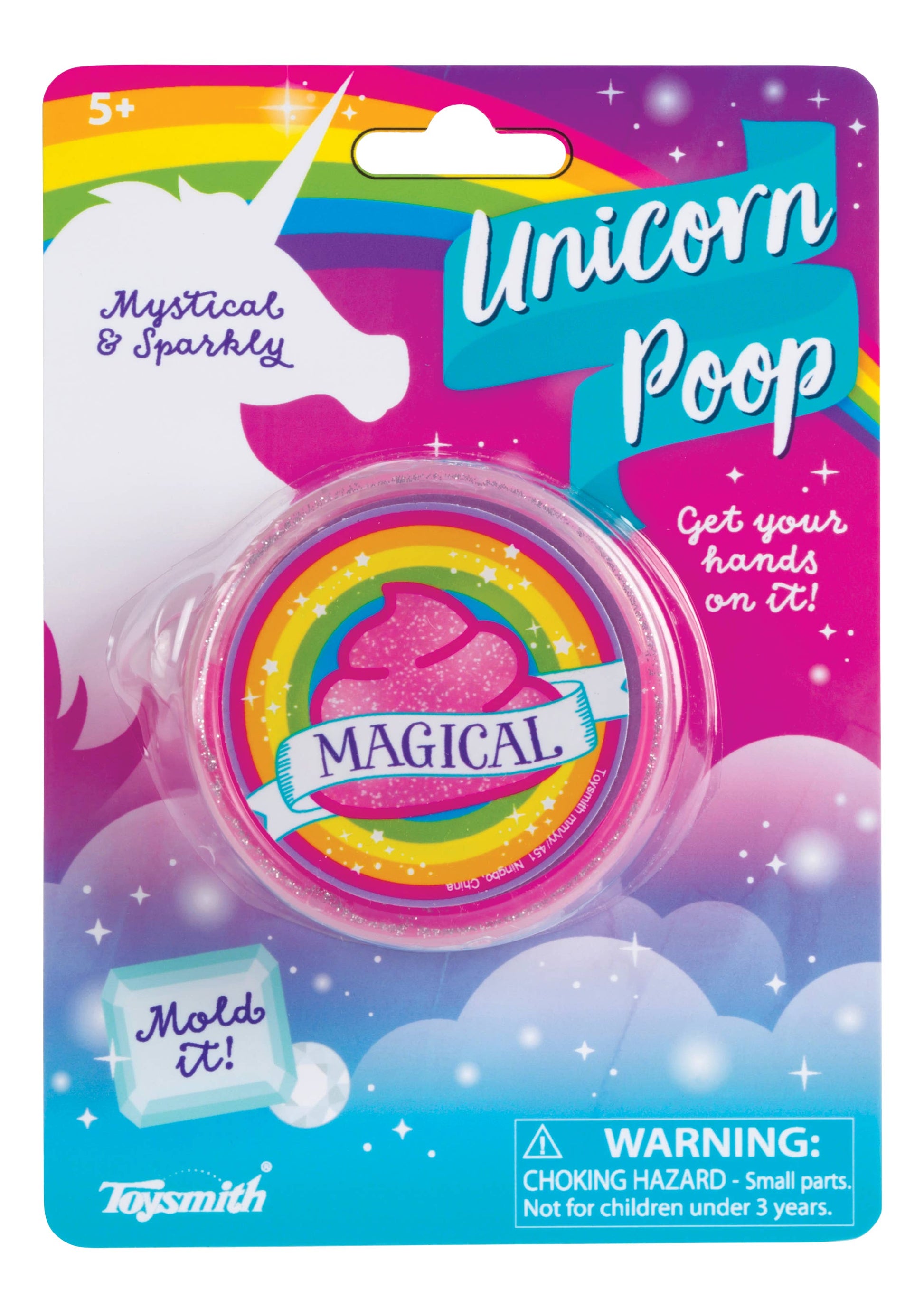 This best-selling colorful fake poop slime toy is designed for laughs. Unicorn Poop is a reusable slime putty that comes in hot pink mixed with shimmering glitter. Designed for tactile and visually pleasing experiences, this toy is individually packaged on a 4.75 x 6.625-inch rainbow and unicorn-illustrated card. Made with nontoxic materials, this nonstick putty is uniquely designed for repeated squishing and stretching.