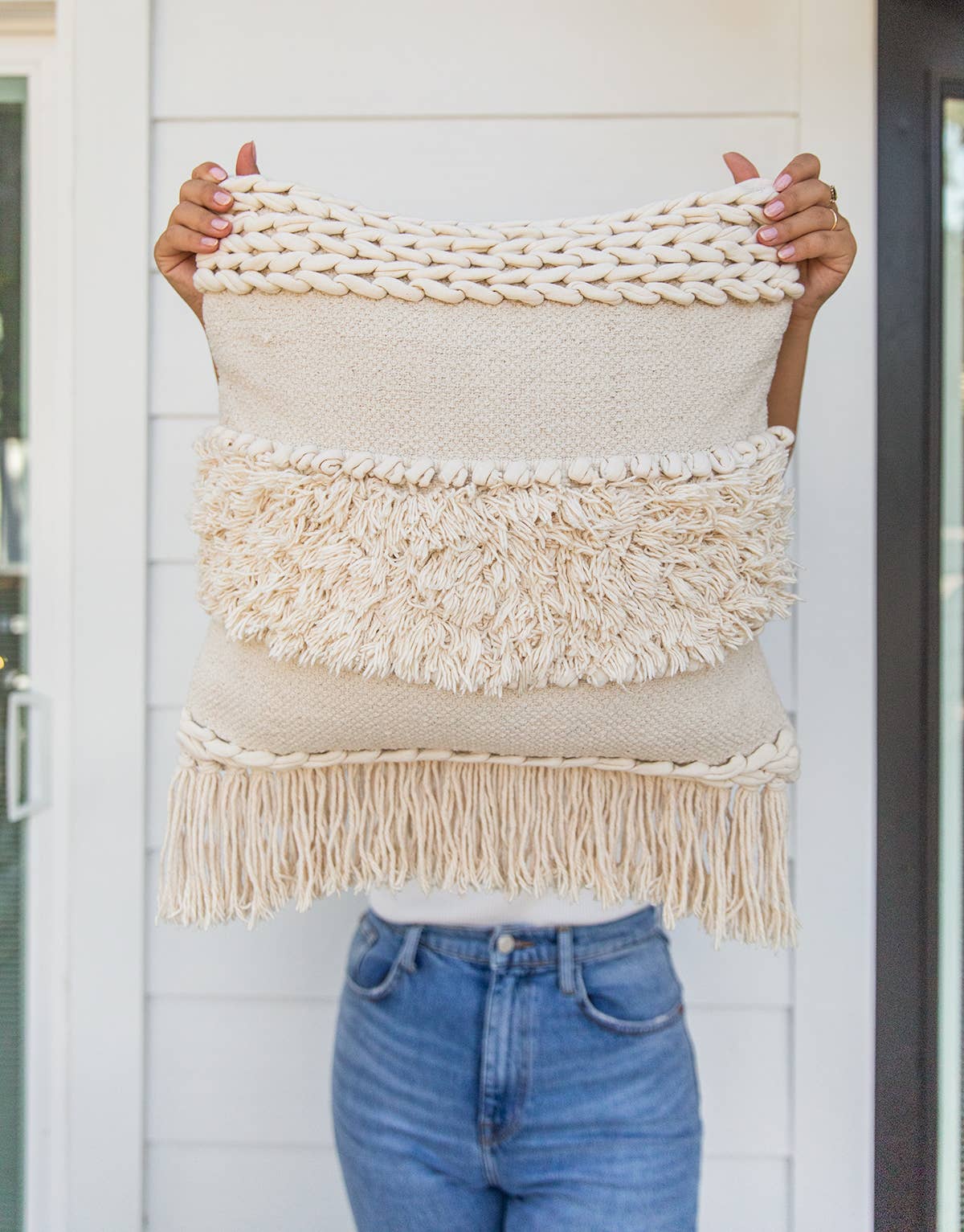 Have your customers appreciate a dash of white pillow that adds the necessary air of sophistication and class to any room. Gorgeous hand-woven throw pillow, with a white base adorned with snowy white tassels.